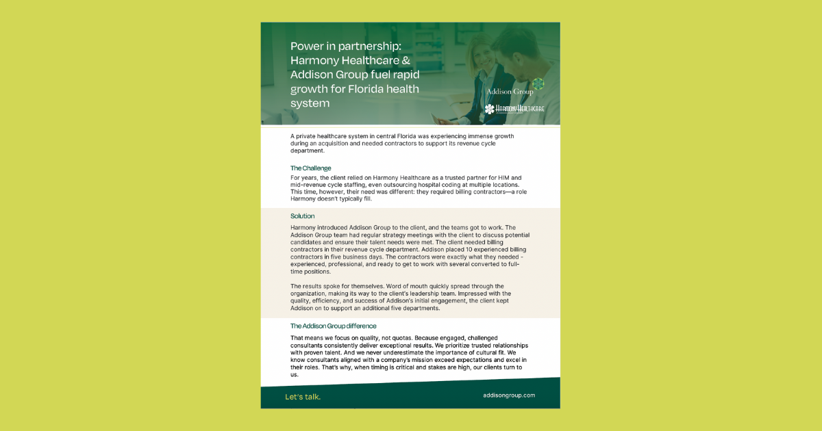 Harmony introduced Addison Group to the client, and the teams got to work. The Addison Group team had regular strategy meetings with the client to discuss potential candidates and ensure their talent needs were met. The client needed billing contractors in their revenue cycle department. Addison placed 10 experienced billing contractors in five business days. The contractors were exactly what they needed – experienced, professional, and ready to get to work with several converted to full-time positions.